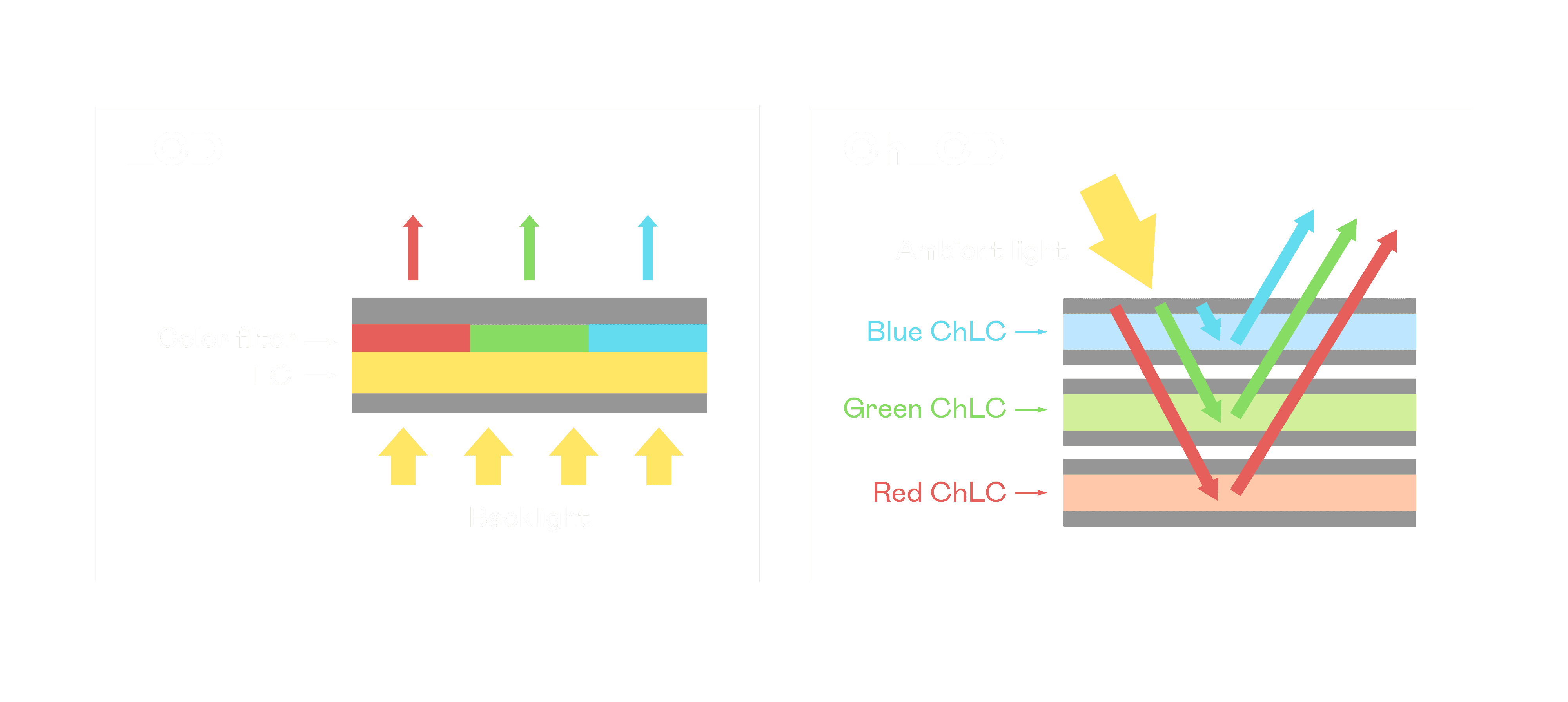 ChLCD 胆固醇液晶就如同纸张一样,,,,透过反射环境光来显示影像,,,,因此长时间观看不易造成人眼视觉疲劳,,可达到护眼效果。。当处于户外阳光下使用,,,LCD 影像容易失真而不易观看,,但胆固醇液晶仍可维持较佳的影像品质。。。。